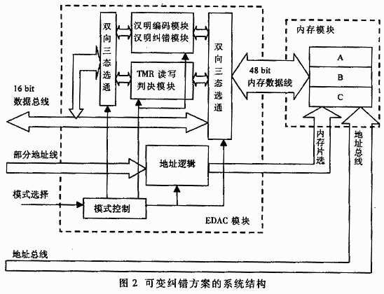 這個(gè)數(shù)據(jù)存儲(chǔ)系統(tǒng)是由3個(gè)位于同一條地址總線上的16bit內(nèi)存模塊組成。每個(gè)內(nèi)存模塊還可以單獨(dú)片選其高字節(jié)或低字節(jié)。這樣通過片選信號(hào)ah、al、bh、bl、ch、cl的控制,實(shí)際上有6個(gè)寬度為8bit的內(nèi)存模塊可以單獨(dú)訪問。48bit(3×16bit)的數(shù)據(jù)線全部接入EDAC控制模塊。當(dāng)系統(tǒng)工作在TMR模式時(shí),ah、al、bh、bl、ch、cl被相同的片選信號(hào)驅(qū)動(dòng)。這樣就構(gòu)成了TMR需要的一個(gè)3×16bit冗余內(nèi)存空間。當(dāng)系統(tǒng)工作在漢明碼模式時(shí),ah,al、bh一組,bl、ch、cl一組,分別被相同的片選信號(hào)驅(qū)動(dòng),構(gòu)成了兩個(gè)獨(dú)立的16+8bit存儲(chǔ)空間。對(duì)于(22,16)漢明碼,每一個(gè)空間實(shí)際使用增加一倍。另外,系統(tǒng)還可以工作在無差錯(cuò)控制模式下。這時(shí),ah、al一組,bh、bl一組,ch、cl一組,分別被相同的片選信號(hào)驅(qū)動(dòng),構(gòu)成了三個(gè)獨(dú)立的16bit存儲(chǔ)空間。這種配置下的內(nèi)存地址空間比TMR模式下增加兩倍。在這些配置模式中,片選的地址譯碼都在EDAC控制模式中完成。