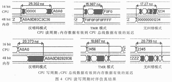 時(shí)序特性是內(nèi)存系統(tǒng)的關(guān)鍵指標(biāo),直接決定著內(nèi)存系統(tǒng)的工作頻率和整個(gè)OBC系統(tǒng)的運(yùn)行速度。由于采用了FPGA器件,對(duì)該內(nèi)存系統(tǒng)的時(shí)序特性分析必須通過FPGA實(shí)現(xiàn)后的時(shí)序仿真來加以研究。在FPGA實(shí)現(xiàn)過程中,通過約束條件來優(yōu)化工具軟件自動(dòng)設(shè)計(jì)生成過程。經(jīng)過反復(fù)優(yōu)化,在Xilinx XCS30XL上實(shí)現(xiàn)后的仿真結(jié)果如圖4所示。可以看出,TMR模式確實(shí)擁有較好的時(shí)序特性,延時(shí)較短。而功能邏輯最為簡(jiǎn)單的無糾錯(cuò)模式由于在實(shí)際中為了優(yōu)化其他模塊做出了延時(shí)上的特殊。