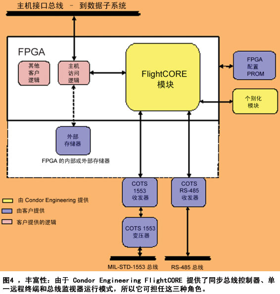 現(xiàn)代 FPGA 的強(qiáng)大功能使其成為 MIL-STD-1553 設(shè)計(jì)的理想選擇,這就是 Condor Engineering 推出 FlightCORE 的原因。FlightCORE 是一種允許設(shè)計(jì)人員在各種 Altera 和 Xilinx 的 FPGA中輕松實(shí)現(xiàn)無(wú)版權(quán)的實(shí)例化設(shè)計(jì)的 MIL-STD-1553 IP。多數(shù)情況下,利用Xilinx 綜合技術(shù) (XST) 或 Altera Quartus II 集成綜合技術(shù) (QIS),FlightCORE 1553 可以在兩天內(nèi)成功地集成。如圖 4 所示,用戶只須將 Condor Engineering 的 IP 核心與其自身邏輯和 Condor Engineering 的個(gè)別化模塊 (3mm x 3mm) 集成,即可實(shí)現(xiàn)高性能的 MIL-STD-1553設(shè)計(jì)。FlightCORE 還允許開發(fā)人員選擇存儲(chǔ)器的大小以恰好地與其系統(tǒng)需求相匹配。圖4還顯示了可以實(shí)施內(nèi)部存貯和/或外部雙端口隨機(jī)存貯器。該產(chǎn)品還提供了 Manchester II編碼與解碼、信息協(xié)議驗(yàn)證與合法化及為接口控制和編程實(shí)施簡(jiǎn)單的共享存貯架構(gòu)等所有的必要組件。只需增加外部收發(fā)器即可,如標(biāo)準(zhǔn)的COTS MIL-STD-1553或RS-485收發(fā)器。
