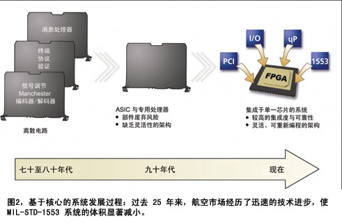 像其它軍用網(wǎng)絡(luò)技術(shù)一樣,航空電子市場(chǎng)中的 MIL-STD-1553 測(cè)試和仿真實(shí)施也經(jīng)歷了從龐大的 DEC Unibus 卡到 19 英寸的通過(guò)機(jī)架安裝的組件,又發(fā)展到用于 VME 和 PCI 系統(tǒng)上的較小、較為集成的多通道背板,現(xiàn)在又出現(xiàn)了更小、集成度更高的 PCMCIA 接口。圖 2 描述了專用的 MIL-STD-1553 ASIC 芯片制造商的實(shí)施從離散的協(xié)議和收發(fā)器芯片組精簡(jiǎn)到單一的體積小、功耗低的 ASIC 的發(fā)展過(guò)程。