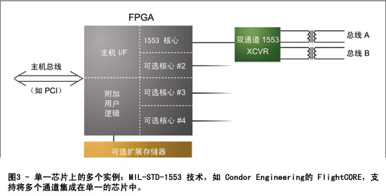 ??? 類似 Condor Engineering 的FlightCORE 這樣的 MIL-STD-1553 解決方案需要少量的FPGA資源,約為 3,000個(gè)邏輯單元,148k bit的內(nèi)存和不到 20個(gè)引腳(不包括外部主存總線)。較小的體積使在單一芯片上放置多個(gè)相互獨(dú)立的實(shí)例成為可能,如圖3 所示,某些程序可以在單一FPGA上集中8到10個(gè)實(shí)例。