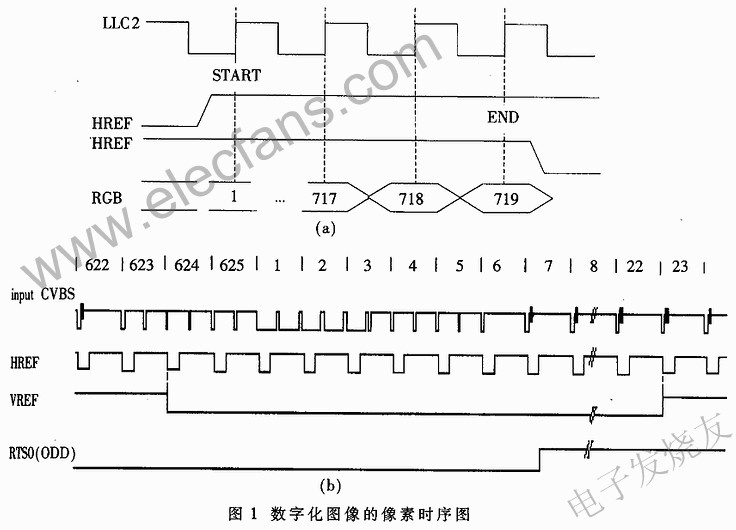 系統(tǒng)設(shè)計(jì)采用SAA7111對(duì)復(fù)合信號(hào)進(jìn)行采樣、同步產(chǎn)生、亮色分離并輸出標(biāo)準(zhǔn)的數(shù)字化信號(hào)。SAA7111輸出的數(shù)字化圖像信息符合CCIR.601建議,PAL制式的模擬信號(hào)數(shù)字化后的圖像分辨率為720×572,像素時(shí)鐘13.5MHz。在本穩(wěn)像系統(tǒng)中要求圖像輸出符合VGA(640×480,60Hz)標(biāo)準(zhǔn),因此在采集數(shù)據(jù)時(shí)要對(duì)數(shù)據(jù)進(jìn)行選擇,避開(kāi)行、場(chǎng)消隱信號(hào)和部分有效像素信息,在較大的圖像中截取所需要的大小。SAA7111向幀存控制電路輸出像素時(shí)鐘(LCC2)、水平參數(shù)(HREF)、垂直參考(VREF)、奇偶場(chǎng)標(biāo)志信號(hào)(ODD)和16位像素信息(RGB565).其中LCC2用來(lái)同步整個(gè)采集系統(tǒng);HREF高電平有效,對(duì)應(yīng)一行720個(gè)有效像素;VREF高電平有效,對(duì)應(yīng)一場(chǎng)信號(hào)中的286個(gè)有效行;ODD=1時(shí),標(biāo)志當(dāng)前場(chǎng)為奇數(shù)場(chǎng);ODD=0時(shí),標(biāo)志當(dāng)前場(chǎng)為偶數(shù)場(chǎng)。采用16位RGB表示每個(gè)像素的彩色信息。圖1(a)為數(shù)字化圖像中的一行像素的時(shí)序圖。其中兩個(gè)HREF分別表示有效行的起始與結(jié)束位置,實(shí)際為一個(gè)信號(hào);可以清楚地看到一行中有效的720個(gè)像素與像素時(shí)鐘LLC2的對(duì)應(yīng)關(guān)系,在采集時(shí)通過(guò)幀存器控制電路選擇其中部的640個(gè)像素進(jìn)行采集。圖1(b)為一幀數(shù)字圖像的輸出時(shí)序圖??梢钥吹皆诘?24~22行時(shí),VREF處于無(wú)效狀態(tài),因此在后續(xù)的采集中,這部分的信息不予處理并通過(guò)ODD的電平區(qū)分奇偶場(chǎng)數(shù)據(jù)。