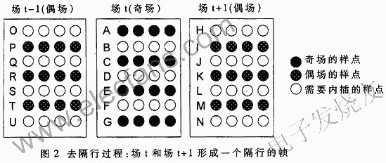 PAL制電視信號(hào)采用隔行掃描機(jī)制,采用人眼的視覺(jué)暫留來(lái)實(shí)現(xiàn)兩場(chǎng)1/50s掃描312.5行的圖像構(gòu)成625行(一幀)圖像。而標(biāo)準(zhǔn)的VGA顯示模式采用逐行掃描方式,在一個(gè)掃描周期內(nèi)實(shí)現(xiàn)對(duì)圖像的完全掃描。因此需要對(duì)視頻信號(hào)進(jìn)行去隔行處理。視頻信號(hào)在經(jīng)過(guò)緩沖后,按照取樣時(shí)鐘把經(jīng)過(guò)模數(shù)轉(zhuǎn)換的數(shù)字信號(hào)送入存儲(chǔ)器緩存,通過(guò)數(shù)據(jù)內(nèi)插的方法進(jìn)行數(shù)據(jù)擴(kuò)展,即相鄰行之間按照一定的算法進(jìn)行加權(quán),從而得到內(nèi)插行的數(shù)據(jù),再以適當(dāng)?shù)乃俣茸x取處理后的數(shù)據(jù),即可實(shí)現(xiàn)倍行頻/倍場(chǎng)頻的掃描。倍行頻掃描可以消除行間的閃爍現(xiàn)象,倍場(chǎng)頻掃描雖然行掃描頻率不變,但是場(chǎng)頻加倍,即能消除行間閃爍現(xiàn)象,還可以消除場(chǎng)間的大面積閃爍。去隔行問(wèn)題的實(shí)質(zhì)就是在每一場(chǎng)中填補(bǔ)被跳過(guò)的那些行,其過(guò)程如圖2所示。