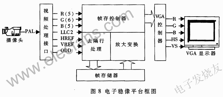 綜上所述,完整的電子穩(wěn)像系統(tǒng)結(jié)構(gòu)如圖8所示。攝像頭輸入的信號(hào)采用PAL制式,經(jīng)過(guò)視頻處理接口后形成RGB565格式的數(shù)字視頻信號(hào)和控制信息;幀存控制器作為整個(gè)平臺(tái)的核心,在將數(shù)據(jù)寫入幀存儲(chǔ)器的同時(shí),對(duì)數(shù)字化的圖像信息進(jìn)行去隔行處理,再將數(shù)據(jù)讀出送往VGA控制器時(shí)進(jìn)行放大變換。VGA控制器則負(fù)責(zé)將數(shù)據(jù)按照VGA標(biāo)準(zhǔn)時(shí)序送往顯示器上。