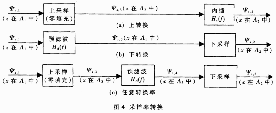 應(yīng)用柵格理論幾何變換處理過(guò)程可以按下面方式進(jìn)行描述:給定一個(gè)定義于點(diǎn)陣Λ1上已采樣信號(hào),需要產(chǎn)生一個(gè)定義于另一個(gè)點(diǎn)陣Λ2上的信號(hào)。如果,Λ1中的每一個(gè)點(diǎn)也在Λ2中,那么此問(wèn)題是上轉(zhuǎn)換(或內(nèi)插)問(wèn)題,可以先將那些在Λ2中而不在Λ1中的點(diǎn)添零(即零填充),然后用一個(gè)作用于Λ2上的內(nèi)插濾波器估計(jì)這些點(diǎn)的值;若Λ1)Λ2,即為下轉(zhuǎn)換(或抽取)問(wèn)題,可以簡(jiǎn)單地從Λ1中取出那么也在Λ2中的點(diǎn)。然而,為避免下采樣信號(hào)中出現(xiàn)混疊,需要對(duì)信號(hào)進(jìn)行預(yù)濾波,以將其帶寬限制到Λ2*的沃格納晶體。上轉(zhuǎn)換和下轉(zhuǎn)換的過(guò)程示于圖4(a)、(b)中。更一般的情況,如果Λ1和Λ2互相不包含,就需要找到另一個(gè)即包括Λ1又包括Λ2的點(diǎn)陣Λ3,可以先將Λ1上采樣到Λ3,然后再下采樣到Λ2。此過(guò)程示于圖4(c)。圖4(c)中Λ3中的中間濾波器完成兩個(gè)任務(wù):首先,內(nèi)插出Λ1中漏下的采樣點(diǎn);其次把Λ3中的信號(hào)頻譜限制于Λ2*的沃格納晶格。