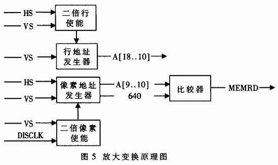 針對(duì)視頻信號(hào)數(shù)據(jù)量大、數(shù)據(jù)流速度的特點(diǎn),采用FPGA設(shè)計(jì),可以完成幀存控制、視頻信號(hào)的實(shí)時(shí)放大與疊加功能?;谶\(yùn)算速度與算法實(shí)現(xiàn)的難易程度分析,對(duì)視頻信號(hào)的放大采用了簡(jiǎn)單的線性插值的辦法,原理如圖5所示。視頻信號(hào)是以場(chǎng)或幀進(jìn)行存儲(chǔ)的,由于數(shù)據(jù)寫入時(shí)存儲(chǔ)地址與圖像顯示的空間位置有確定的對(duì)應(yīng)關(guān)系,因此系統(tǒng)需要的放大處理就變?yōu)閷?duì)幀存儲(chǔ)體的地址線的控制問(wèn)題。