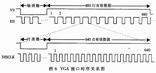 標(biāo)準(zhǔn)的VGA(640×480,60Hz)接口需要提供以下幾組信號(hào):3個(gè)RGB模擬信號(hào)、行同步信號(hào)HS和場(chǎng)同步信號(hào)VS。它的信號(hào)時(shí)序如圖6所示。