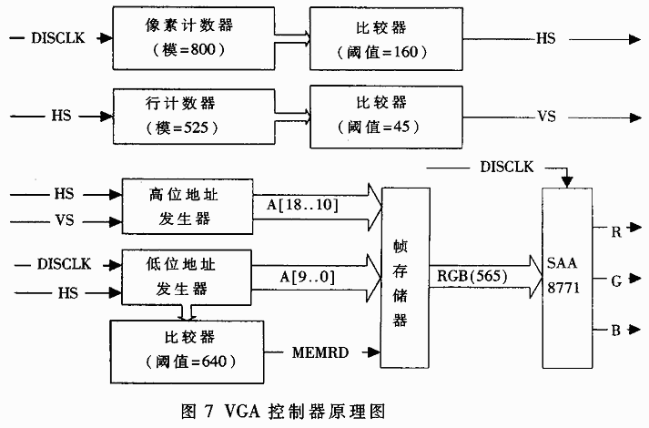 DISCLK為視頻顯示時(shí)鐘,頻率為25MHz,首先輸入到模等于800的像素計(jì)數(shù)器中,輸出的計(jì)數(shù)值與一個(gè)預(yù)先設(shè)好的比較器進(jìn)行比較,當(dāng)計(jì)數(shù)器的值大于160時(shí),輸出高電平,反之輸出低電平,作為行同步信號(hào);同理,利用一個(gè)模等于525的計(jì)數(shù)器對(duì)行同步信號(hào)進(jìn)行計(jì)數(shù)和一個(gè)閾值為45的比較器可以產(chǎn)生所需要的場(chǎng)同步脈沖VS。
