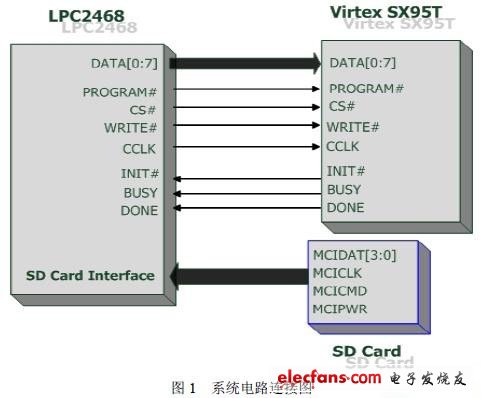 是Xilinx 公司的Virtex SX95T。存儲(chǔ)配置數(shù)據(jù)的介質(zhì)是成本較低而且使用廣泛的SD 卡?! ∠到y(tǒng)的工作原理是上電時(shí)微控制器LPC2468 從SD 卡中讀取FPGA 的配置文件,然后 通過(guò)其通用IO