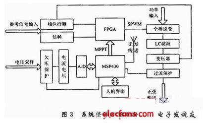 該系統(tǒng)以MCU-FPGA為構(gòu)架,實(shí)現(xiàn)了風(fēng)光逆變并網(wǎng)系統(tǒng)。系統(tǒng)充分利用了數(shù)字系統(tǒng)的計(jì)算精度,將逆變波形與外網(wǎng)市電的相位差控制在2°以內(nèi),并且通過最大功率追蹤,讓太陽能電池板或者風(fēng)力發(fā)電機(jī)的發(fā)電效率達(dá)到最大。該系統(tǒng)成本低,體積小,且人性化設(shè)計(jì),方便今后直接大批量投入市場(chǎng)使用。系統(tǒng)的功率電路部分采用全橋拓?fù)溥M(jìn)行逆變,數(shù)字控制系統(tǒng)采用MCU-FPGA構(gòu)架。由全硬件完成對(duì)外網(wǎng)市電的倍頻工作,再由FPGA動(dòng)態(tài)調(diào)整系統(tǒng)輸出相位,讓輸出和外網(wǎng)市電實(shí)現(xiàn)同相位。MCU完成對(duì)太陽能電池板的最大功率點(diǎn)追蹤(MPPT),發(fā)電端電壓欠壓檢測(cè)以及孤島效應(yīng)檢測(cè)等功能。針對(duì)電力系統(tǒng)強(qiáng)電的特性并結(jié)合當(dāng)今熱門的物聯(lián)網(wǎng)技術(shù),該系統(tǒng)人性化地設(shè)計(jì)了無線檢測(cè)的功能,用戶能通過手機(jī),計(jì)算機(jī)或者手持式終端就可以了解當(dāng)前系統(tǒng)狀態(tài)。該系統(tǒng)創(chuàng)造性的設(shè)計(jì)方式既可以用于電廠的多能源并行發(fā)電,也適合家用,讓家庭從用電的角色轉(zhuǎn)變微型發(fā)電廠,從而大大的緩解能源問題。