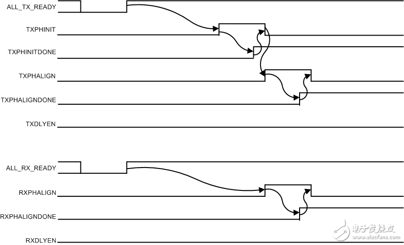 當TX Buffer被使能時,可以通過TXBUFSTATUS的Bit0(Half Full)的狀態(tài)和TXPIPPM的調(diào)整實現(xiàn)TX通道同步。上電后TX通道間的相位和TXBUFSTATUS都處于隨機狀態(tài),相位超前與延遲以及超前和延遲的UI數(shù)量都是不確定的