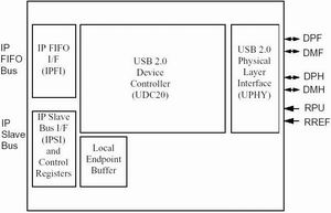 USB2.0模塊依靠片上USB設(shè)備控制器(UDC 20)和USB物理層接口(UPHY),支持USB全速和高速協(xié)議。USB2.0模塊的示意框圖如圖1所示。