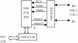 可以看出,其USB模塊由3部分組成,即USB控制邏輯、USB收發(fā)器 和USB寄存器。各部分的功能特性如下: