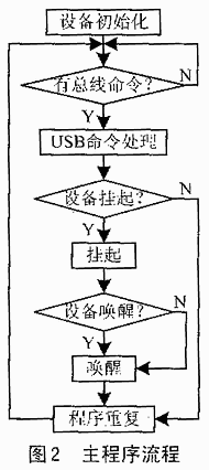 T3351所支持的RBC命令集包括INQUIRY、READ FORMAT CAPASCITIES、READ、WTITE等等,有關(guān)RBC命令可從相應(yīng)協(xié)議中得到。系統(tǒng)通過READ命令讀取硬盤的啟動扇區(qū),并分析其文件系統(tǒng)結(jié)構(gòu),然后讀取其它扇區(qū)進(jìn)行文件的操作。T33510的IDE接口設(shè)計有對硬盤操作所需的各個寄存器,符合Compact Flash Specification Rev.1.3協(xié)議,給程序編制帶來了很大方便。由于所有的文件系統(tǒng)和數(shù)據(jù)的分析都交由PC端來執(zhí)行,因此在IDE接口上,只需提供基本的“Sectors Read”和“Sectors Write”等命令就可以了。主程序流程如圖2所示。