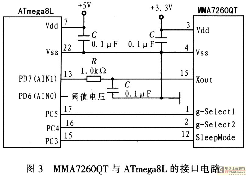 2.2 加速度傳感器MMA7260QT與單片機(jī)接口設(shè)計(jì)