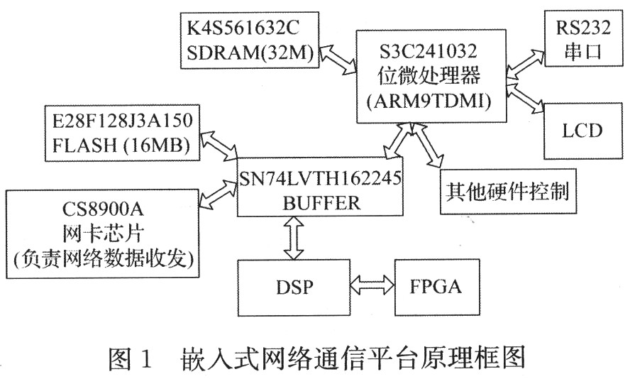 ??? 本通信系統(tǒng)的硬件平臺由以下幾個部分組成:S3C2410主CPU芯片控制嵌入式外圍設備的存儲、通信、保護、調(diào)試、顯示等操作;DSP和FPGA負責信號數(shù)據(jù)的采集和處理;CS8900A負責網(wǎng)絡數(shù)據(jù)的收發(fā);其他部分還包括串口RS232的通信、LCD的數(shù)據(jù)顯示、數(shù)據(jù)存儲FLASH和SDRAM以及其他硬件控制等。本硬件通信平臺的原理框圖如圖1所示。