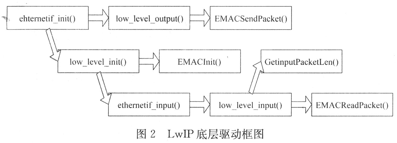 ??? 底層網(wǎng)絡驅動的框架LwIP已經(jīng)為我們實現(xiàn)了絕大部分(如圖2所示),我們只需要在作者設計好的框架中完成與底層硬件相關的部分即可。即我們只需要實現(xiàn)與硬件相關的網(wǎng)卡初始化函數(shù)網(wǎng)絡數(shù)據(jù)包發(fā)送函數(shù)和網(wǎng)絡數(shù)據(jù)包接收函數(shù)。