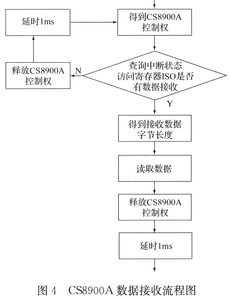 ? 數(shù)據(jù)接收時,它將從以太網(wǎng)收到的數(shù)據(jù)幀在經(jīng)過解碼、去掉幀頭和地址檢驗等步驟后緩存在片內(nèi)。在CRC校驗通過后,它會根據(jù)初始化配置情況,通知主機CS8900A收到了數(shù)據(jù)幀,然后傳到主機的存儲區(qū)中。數(shù)據(jù)接收流程圖如圖4所示。