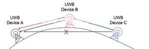 如圖3所示為由三個(gè)UWB設(shè)備構(gòu)建的一個(gè)Ad Hoc網(wǎng)絡(luò)。其中,設(shè)備A對(duì)設(shè)備C來(lái)說(shuō)是不可見(jiàn)的。設(shè)備A(圖中左邊的設(shè)備)即便不能“聽(tīng)”到設(shè)備C,也有可能知道設(shè)備C的存在及其所占用的時(shí)隙,因?yàn)槠淇赏ㄟ^(guò)所謂的“信標(biāo)”(beacon)來(lái)了解設(shè)備C。信標(biāo)保存了鄰近設(shè)備的信息,因而設(shè)備可以彼此了解。在能夠相互接收信息的所有設(shè)備之間,可能在任何方向直接傳輸數(shù)據(jù)。