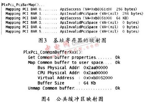 查看PCI9054的配置情況,圖3所示為五個(gè)基址寄存器的映射情況。圖4所示為公共緩沖區(qū)的映射情況示意圖。