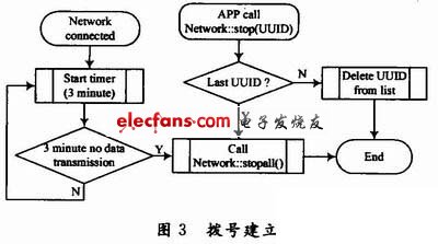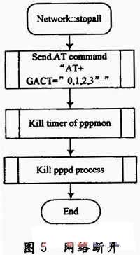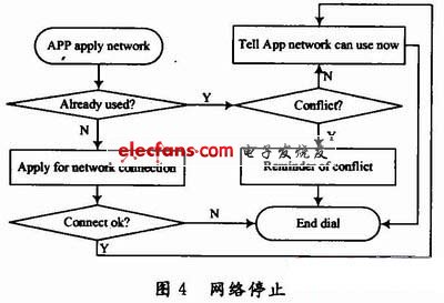 (5)網(wǎng)絡(luò)停止。網(wǎng)絡(luò)停止分兩種情況:一種情況是當(dāng)前網(wǎng)絡(luò)三分鐘內(nèi)無數(shù)據(jù)傳輸,則停止應(yīng)用程序與網(wǎng)絡(luò)的連接。另一種情況,應(yīng)用程序主動(dòng)要求與網(wǎng)絡(luò)斷開,若只有該應(yīng)用程序與網(wǎng)絡(luò)連接,則斷開網(wǎng)絡(luò);若還有其他應(yīng)用程序與網(wǎng)絡(luò)連接,則結(jié)束該應(yīng)用進(jìn)程。網(wǎng)絡(luò)停止如圖4所示。