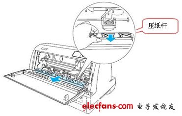 7、放回壓紙桿,調整紙厚調節(jié)桿在適合位置,關閉打印機上蓋,色帶安裝完成