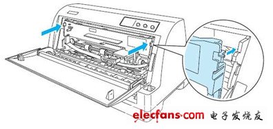 5、捏住色帶導軌并將兩邊突起部分沿打印頭的插槽滑入,推動色帶導軌中心直到鎖定到位。如 圖所示。