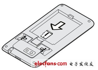 可使用存儲卡存儲照片、視頻和音樂。取下背蓋。取出電池。將 microSD? 卡金色觸點朝下插入存儲卡槽中,再將它推到底。