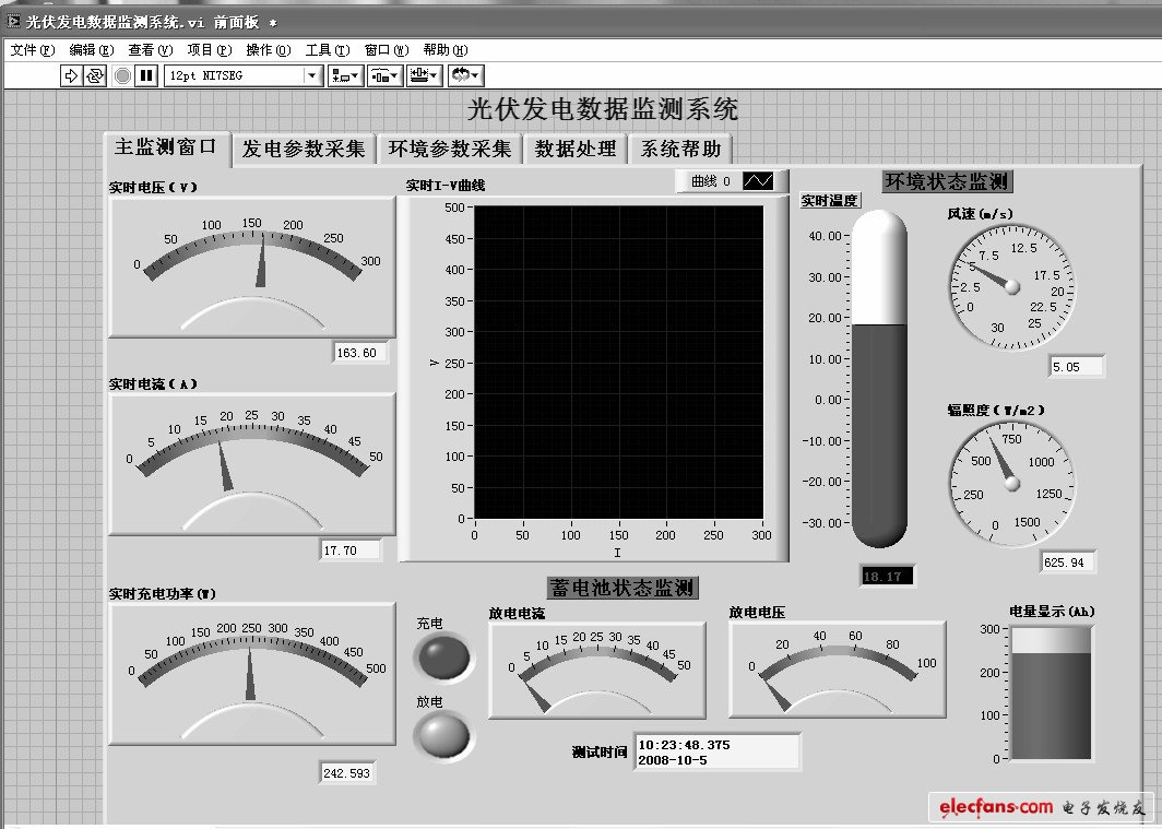 光伏發(fā)電系統(tǒng)的能量輸出因周?chē)h(huán)境的變化而表現(xiàn)出較大的差異,對(duì)光伏發(fā)電系統(tǒng)進(jìn)行實(shí)時(shí)監(jiān)測(cè),可以獲得原始測(cè)量數(shù)據(jù),為系統(tǒng)的改進(jìn)與優(yōu)化以及以后的科學(xué)研究提供有用數(shù)據(jù),對(duì)系統(tǒng)環(huán)境參數(shù)及其系統(tǒng)本身的電氣性能進(jìn)行監(jiān)測(cè)和分析是保證系統(tǒng)正常高效運(yùn)行的前提。光伏發(fā)電系統(tǒng)的運(yùn)行一般是在無(wú)人職守的情況下進(jìn)行,對(duì)地面上很分散的光伏系統(tǒng)進(jìn)行監(jiān)測(cè)維護(hù)是十分困難繁瑣的,需要大量的時(shí)間和人力物力,因此在光伏發(fā)電系統(tǒng)中采用遠(yuǎn)程數(shù)據(jù)監(jiān)測(cè)系統(tǒng)具有重要意義。Labview可以利用高性能的模塊化硬件,結(jié)合高效靈活的軟件來(lái)完成各種測(cè)試、測(cè)量和自動(dòng)化應(yīng)用。靈活高效的軟件可以創(chuàng)建自定義的光伏監(jiān)測(cè)系統(tǒng)的用戶(hù)界面并能提供強(qiáng)大的后續(xù)數(shù)據(jù)處理能力,可以方便的設(shè)置數(shù)據(jù)處理、轉(zhuǎn)換、存儲(chǔ)的方式[4].模塊化的硬件能方便的提供全方位的系統(tǒng)集成,另外Labview還有網(wǎng)頁(yè)發(fā)布、報(bào)告生成、數(shù)據(jù)管理以及軟件連接等功能。本文利用Labview的強(qiáng)大功能配合FieldPoint模塊化分布式I/O設(shè)計(jì)了一種光伏發(fā)電數(shù)據(jù)監(jiān)測(cè)系統(tǒng),并通過(guò)網(wǎng)頁(yè)發(fā)布的功能達(dá)到遠(yuǎn)程監(jiān)測(cè)的目的。