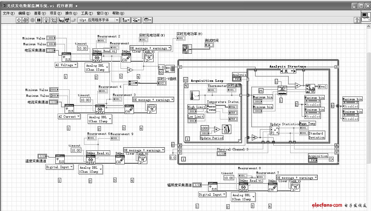 圖5是光伏發(fā)電數(shù)據(jù)監(jiān)測(cè)系統(tǒng)前面板對(duì)應(yīng)的部分程序框圖,主要包括電壓采集、電流采集、輻照度采集、溫度采集及其處理程序。
