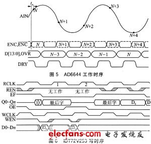 通過兩個(gè)“與”門分別對(duì)A/D轉(zhuǎn)換器和FIFO的寫時(shí)鐘進(jìn)行控制,因?yàn)锳D6644從模擬輸入開始到該次轉(zhuǎn)換的數(shù)據(jù)出現(xiàn)在輸出口上需要4個(gè)時(shí)鐘周期,并且在高速度采樣時(shí)導(dǎo)線的延時(shí)效果會(huì)非常明顯,若把A/D轉(zhuǎn)換器和FIFO的時(shí)鐘連在一起,很可能過多地采到無效數(shù)據(jù)。分開控制以后,通過軟件延時(shí),可以方便地分別對(duì)A/D轉(zhuǎn)換器和FIFO的時(shí)鐘進(jìn)行控制,調(diào)試起來相當(dāng)方便,力圖把采到無效數(shù)據(jù)的位數(shù)減至最低。AD6644的工作時(shí)序如圖5所示,IDT72V253寫時(shí)序如圖6所示。