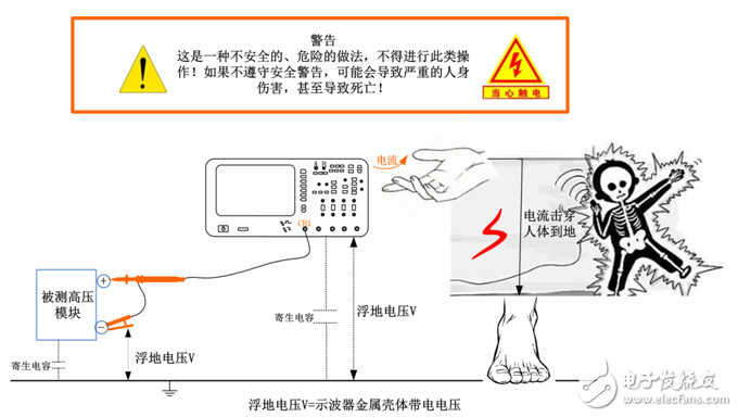 `` 示波器浮地測量的危害 很多工程師有這樣的一個習(xí)慣:當(dāng)要測量高壓信號時,習(xí)慣性的把電源插頭的保護地斷開,使用普通無源探頭直接進(jìn)行高壓的浮地測量,結(jié)果就是“啊,我被電到了!”。是的,你不是被美女