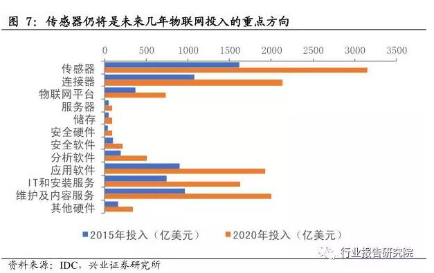 傳感器是物聯(lián)網(wǎng)感知層的設(shè)備,包括溫度傳感器、壓力傳感器、麥克風(fēng)等等。據(jù)IDC統(tǒng)計(jì),2015年全球?qū)鞲衅鞯耐度胝紝?duì)物聯(lián)網(wǎng)總投入的四分之一,而到2020年,對(duì)傳感器方面的投入將突破3151億美元,遠(yuǎn)超其他技術(shù)。