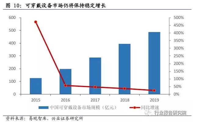 可穿戴設(shè)備以多種形式為用戶(hù)提供便攜式的智能娛樂(lè)和監(jiān)測(cè)服務(wù),并以此獲取用戶(hù)日常行為數(shù)據(jù)。2015年是智能可穿戴設(shè)備的爆發(fā)年,全年增速超過(guò)470%,在2016年后增速趨于穩(wěn)定,預(yù)計(jì)2019年我國(guó)智能可穿戴設(shè)備市場(chǎng)可達(dá)到487.1億的市場(chǎng)規(guī)模。
