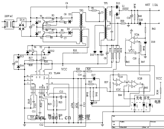 這種充電器的控制芯片一般是以TL494為核心,推動(dòng)2只13007高壓三極管。配合LM324(4運(yùn)算放大器),實(shí)現(xiàn)三階段充電。