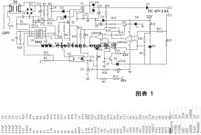 常用電動(dòng)車充電器根據(jù)電路結(jié)構(gòu)可大致分為兩種。第一種是以u(píng)c3842驅(qū)動(dòng)場(chǎng)效應(yīng)管的單管開(kāi)關(guān)電源,配合LM358雙運(yùn)放來(lái)實(shí)現(xiàn)三階段充電方式。其電原理圖和元件參數(shù)見(jiàn)(圖表1)