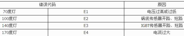 E0---無(wú)鍋. E1---電壓過(guò)低. E3---爐面溫度過(guò)高. E4---爐面?zhèn)鞲衅?/div>