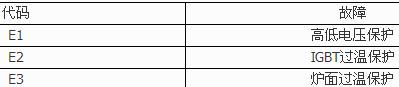 EO;鍋具檢測(cè) E2;爐面溫度傳感器故障 E3;高電壓保護(hù) E4;低電壓保護(hù) E5爐面超