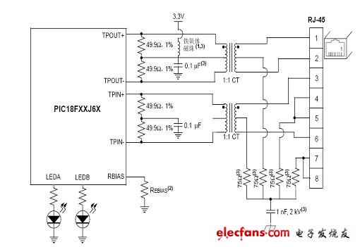 本文的連接解決方案,完全實現(xiàn)介質(zhì)訪問控制和物理層收發(fā)器模塊,只需使用兩個脈沖變壓器和一些無源器件即可將單片機直接與以太網(wǎng)相連。網(wǎng)絡(luò)接口電路如圖4所示,TPIN+/TPIN- 和TPOUT+/TPOUT- 引腳與用于以太網(wǎng)操作的1:1 中心抽頭脈沖變壓器相連。當(dāng)使能以太網(wǎng)模塊時,兩個TPOUT 引腳會有持續(xù)的電流流入;當(dāng)收發(fā)器模塊在發(fā)送數(shù)據(jù)時,通過改變TPOUT+ 和TPOUT-的相對電流大小,將在以太網(wǎng)電纜上產(chǎn)生一個差分電壓,發(fā)送和接收接口均需要另外使用兩個電阻和一個電容正確與傳輸線相連,最大限度地減少信號反射,增加通信信號的穩(wěn)定。