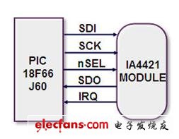 IA4421只需使用5個I/O口即可工作,采用SPI兼容控制接口作為數(shù)據(jù)通訊接口。各個接口功能如下:SCK:SPI串口時鐘輸入;SDI:SPI串口數(shù)據(jù)輸入;NSEL:SPI片選輸入(低電平有效);SDO:SPI串口數(shù)據(jù)輸出;NIRQ:中斷請求輸出(低電平有效);芯片具有體積小、功耗低等優(yōu)點,非常適合于無線設(shè)備。電路連接如圖5所示。