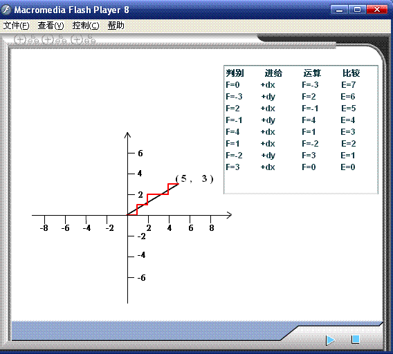 下面以實(shí)例來(lái)驗(yàn)證圖2—1。設(shè)欲加工直線(xiàn)OA,其終點(diǎn)坐標(biāo)為 =5*, =3*,則終點(diǎn)判別值可取為 (終點(diǎn)判別方法詳見(jiàn)下述)。開(kāi)始時(shí)偏差 ,加工過(guò)程的運(yùn)算節(jié)拍如表2—1所示。