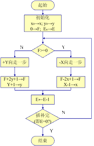 和直線(xiàn)插補(bǔ)一樣,除偏差計(jì)算外,還要進(jìn)行終點(diǎn)判別計(jì)算。每走一步,都要從兩坐標(biāo)方向總步數(shù)中減去1,直至總步數(shù)被減為零(發(fā)終點(diǎn)到達(dá)信號(hào))時(shí)為止,才終止計(jì)算。?????????????????????????????????????????