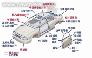 圖示汽車(chē)中不同的密封件系統(tǒng),原則上可分為靜態(tài)密封件和動(dòng)態(tài)密封件。大部分型材系統(tǒng)均采用擠塑成形,但是,隨著系統(tǒng)設(shè)計(jì)整合和零部件性能提高,角造型和端蓋等外形較復(fù)雜的注塑部件比例亦不斷增加。