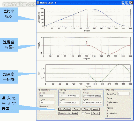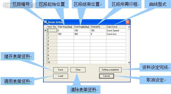 在軟件中我們可以清楚地利用圖形方式設(shè)定、修改電子凸輪曲線。當(dāng)我們點擊進入資料表單設(shè)定按鈕時會彈出下面的區(qū)段設(shè)置表。使用者需先設(shè)定Start Ang, End Ang, Stroke以及透過下拉式選單選取CAM curve(具有連續(xù)、正弦、勻加速等6種曲線,并可加入其它標(biāo)準(zhǔn)曲線和自定義曲線),在設(shè)定完成后按下Setting completed按鈕, 即可在主畫面繪制位移, 速度, 加速度坐標(biāo)圖7所示。