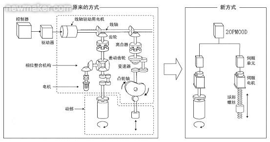 參見圖5,凸輪是用于實現(xiàn)機械三維空間聯(lián)動傳動關(guān)系與控制的機械結(jié)構(gòu)。自動化運動控制系統(tǒng)用軟件程序與伺服電機實現(xiàn)三維空間聯(lián)動傳動關(guān)系與控制的軟件系統(tǒng)就是電子凸輪功能。從圖5可以看到,左邊是我們常見的機械式凸輪方式,而右邊就是電子凸輪方式。也就是說利用程序的方式(配合伺服單元)完成機械凸輪控制所需要的軌跡,實現(xiàn)主軸和從軸的嚙合運動。