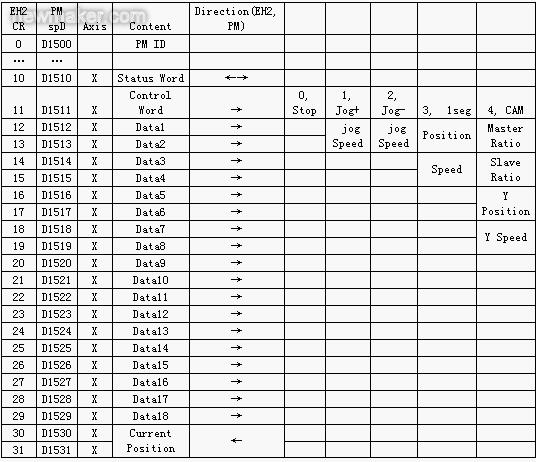 此外,對于程序編寫也十分簡單方便,利用PMSoft編程軟件設(shè)置好cam table后,直接控制對應(yīng)的內(nèi)部寄存器即可完成電子凸輪運行。表2為X軸排線軸內(nèi)部寄存器表,例如在對應(yīng)的D1511中傳送不同數(shù)值即可實現(xiàn)0(停止)、1(正向點動)、2(反向點動)、3(單段速運動)、4(電子凸輪運動),其它寄存器同樣有各自功能。