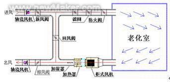 在正常情況下(溫濕度),關(guān)閉進風(fēng)閥和排風(fēng)閥,停止進風(fēng)電機和排風(fēng)電機,打開回風(fēng)閥和防火閥,啟動回風(fēng)風(fēng)機,保持老化房內(nèi)回風(fēng)循環(huán);