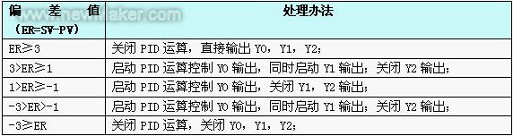 為便于對整個老化房內(nèi)溫度的控制,同時充分利用EC20 PLC自身PID功能和PWM脈沖輸出(Y0,Y1)的優(yōu)勢,室內(nèi)溫度區(qū)域分為2個部分(上層和下層各8個測溫度點),對溫度取平均值作為溫度的測量值,并把此平均值送入PID功能塊進行運算,同時對加熱執(zhí)行元件(參考EC20 PLC的I/O接線圖,固態(tài)繼電器SSR1,SSR2,SSR3所控制的發(fā)熱管的功率逐漸加大)也進行了分組處理:溫度偏差較小的情況下,進行PID運算,通過Y0輸出脈沖給SSR1,同時關(guān)閉SSR2,SSR3(即Y1,Y2停止輸出);如果溫度偏差較大,則Y1,Y2也參加輸出,具體處理思路如下: