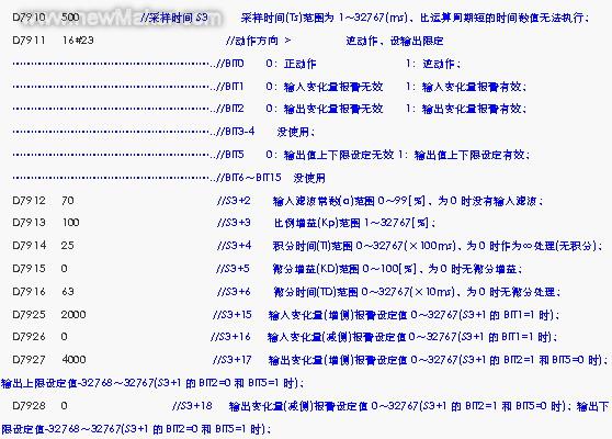 實現(xiàn)步驟具體如下:首先,在數(shù)據(jù)塊設(shè)定PID各參數(shù),其中的重點是設(shè)置P,I,D三個參數(shù)和輸出量的上下限范圍,由于PID的輸出結(jié)果直接和PWM結(jié)合在一起,所以設(shè)置時要特別注意,在本例子中,按照PWM的周期為4秒(=4000MS)計算,把PID的輸出上下限分別設(shè)定為4000和0;另外按照逆動作(BIT0=1),輸出限定(BIT5=1)的要求對D7911各位進行賦值;