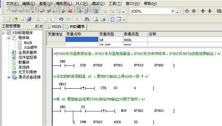 其次,在程序里調(diào)用PID指令和PWM指令用于控制Y0的輸出(對SV和PV的比較而進行的邏輯控制輸出較簡單,故此處省略)。